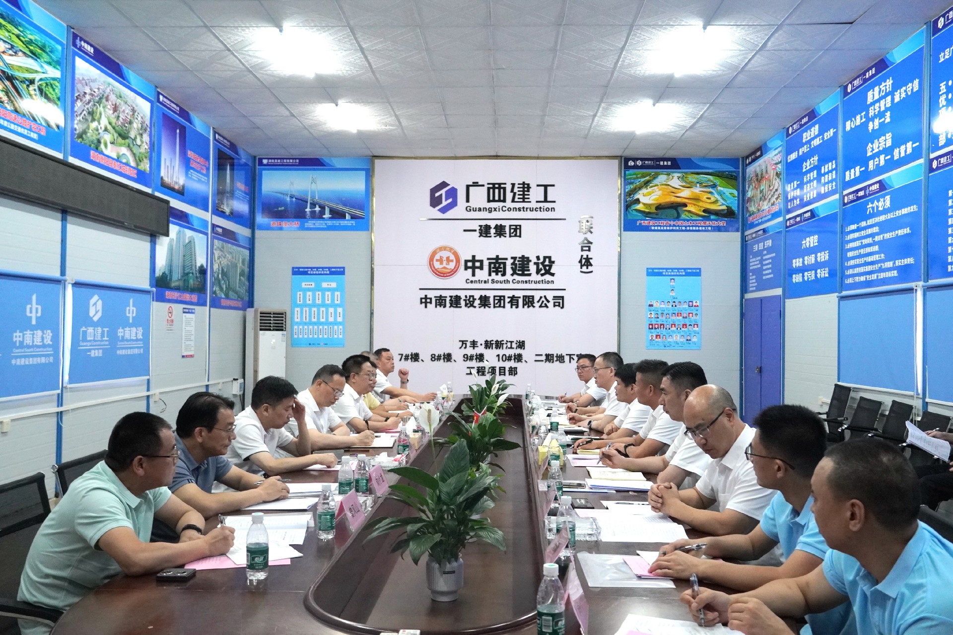 谈文胜一行先后来到项目建设工地、职工食堂、职工宿舍、党建活动室等地,认真查看并详细了解了项目施工进度、基层党建、安全生产、技术应用、职工生活住宿等情况,现场提出安全生产隐患整改意见。随后组织召开了项目座谈会,听取项目各项重点工作情况汇报,研究部署下阶段工作任务。集团公司党委书记、董事长申志刚代表项目部做工作情况汇报,广西建工一建集团第六分公司总经理高长亮,湖南基础公司总经理凌刚作了补充情况说明。与会人员围绕项目管理、安全生产、科技创新等内容开展座谈交流。